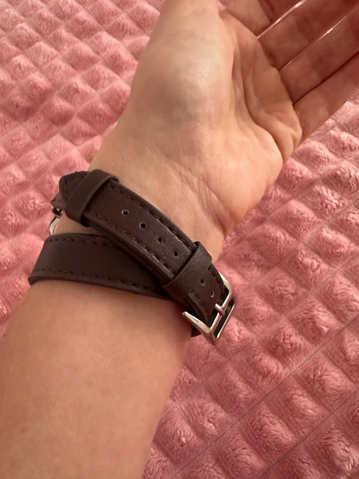 Livré dans un sachet à fermeture éclair, avec la montre qui mesure 40 cm. Je ne suis pas entièrement satisfait de la couleur, j’ai longuement hésité entre le marron foncé et le marron clair, j’ai finalement opté pour le foncé. C’est trop foncé, littéralement noir. Il manque vraiment une couleur chocolat moyen entre le marron foncé et le marron clair. Mais dans l’ensemble, le bracelet est élégant et bien fait.