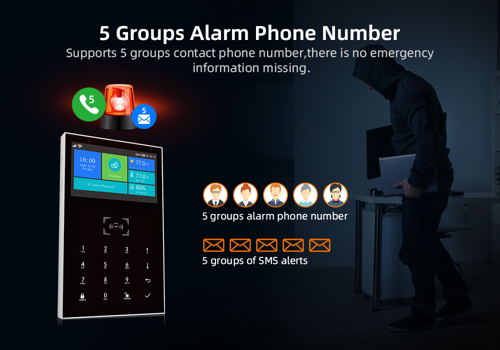 Jusqu’à 5 groupes de numéros de téléphone d’alarme préréglés, SMS on/off et voix on/off peuvent être réglés respectivement.