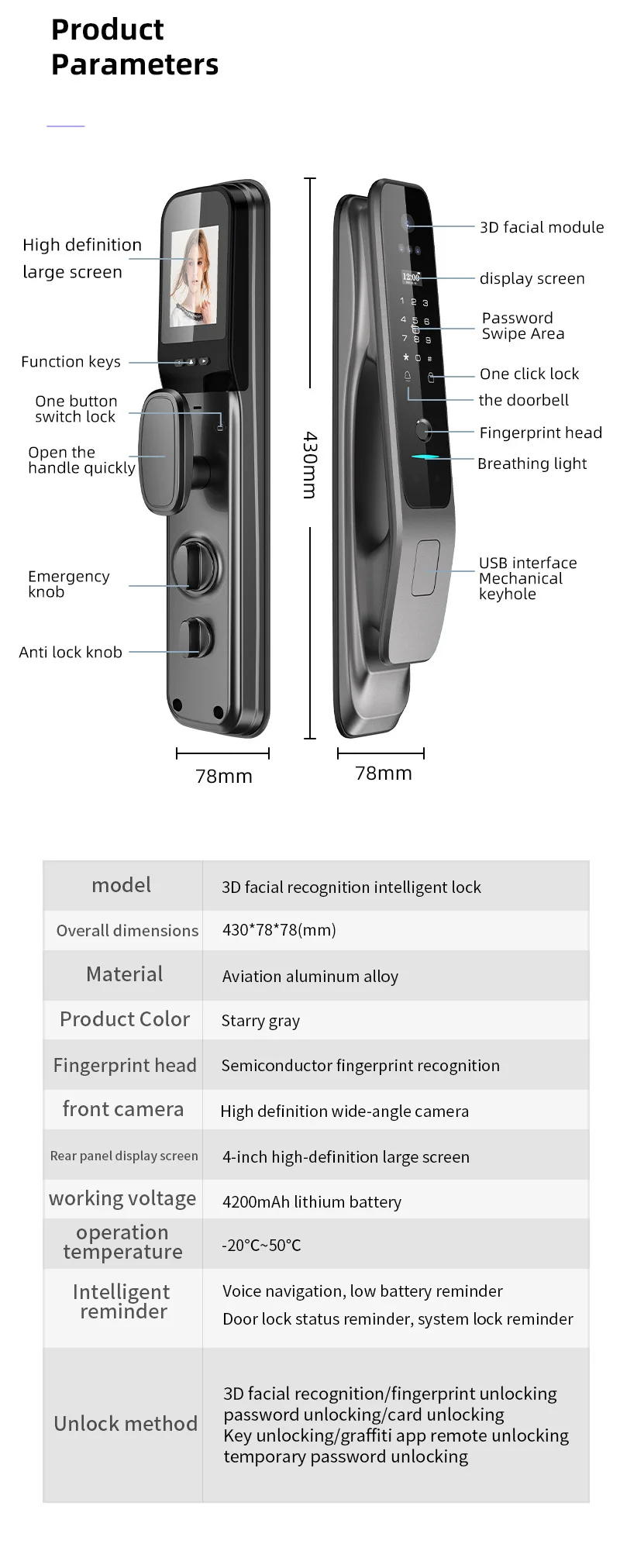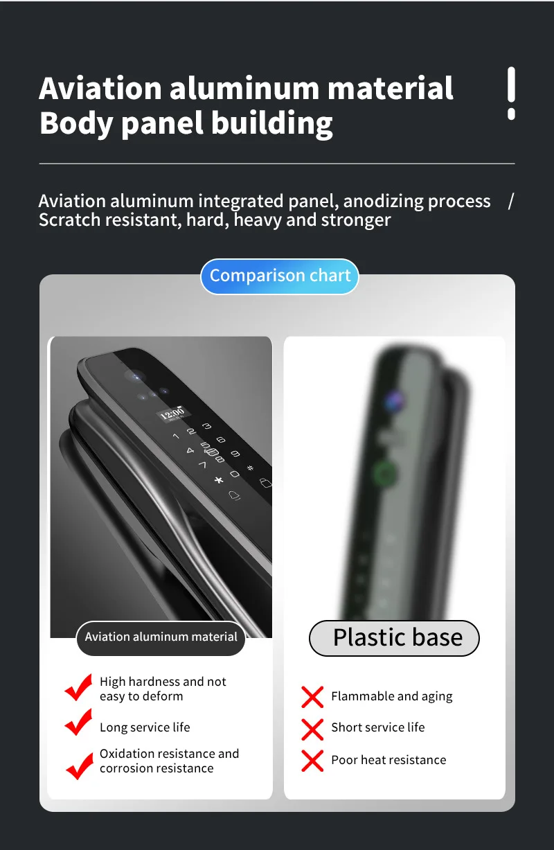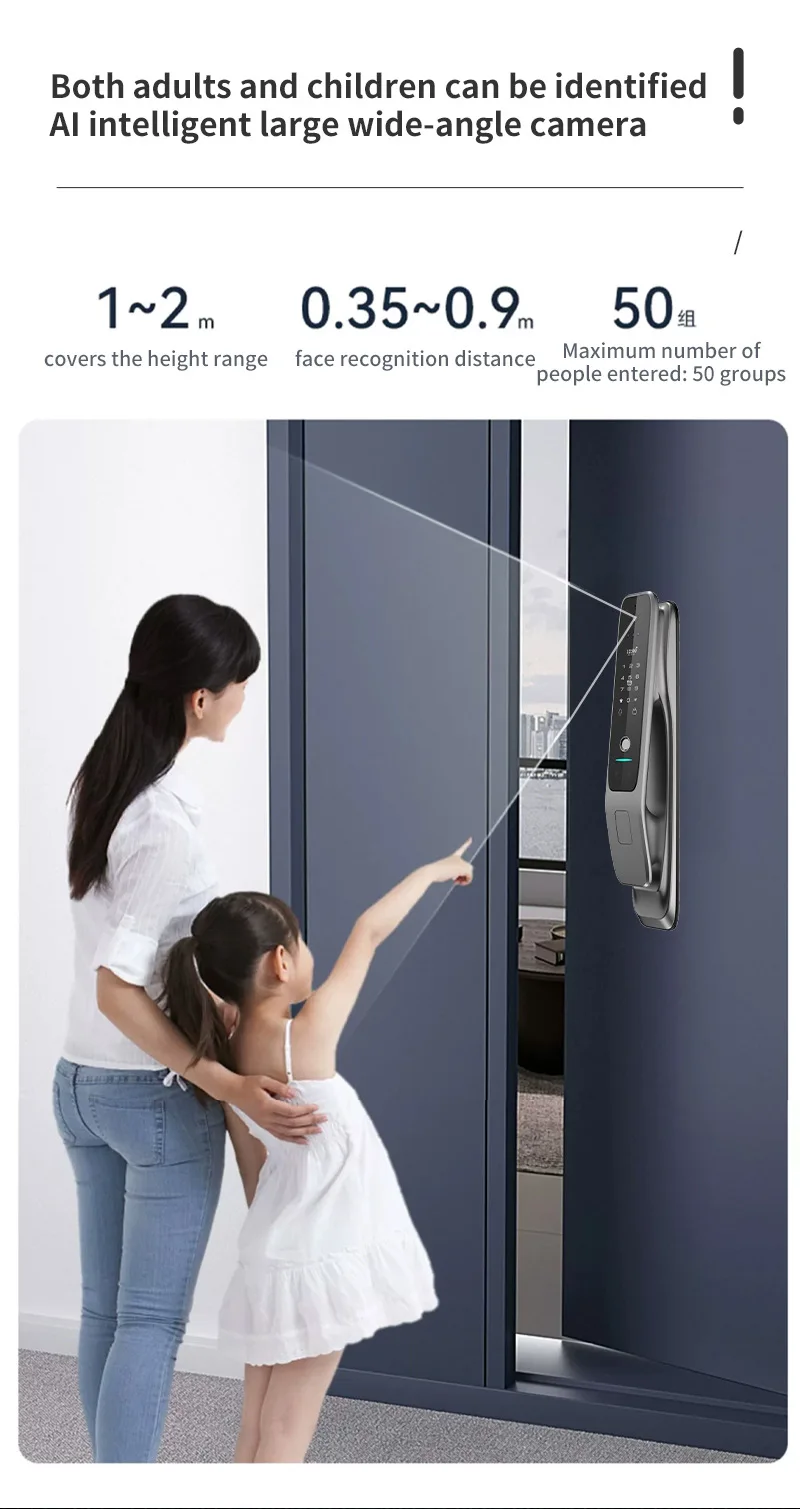 1. 6 moyens de déverrouillage: visage infrarouge 3D, empreinte digitale, mot de passe, carte IC, clé mécanique, application