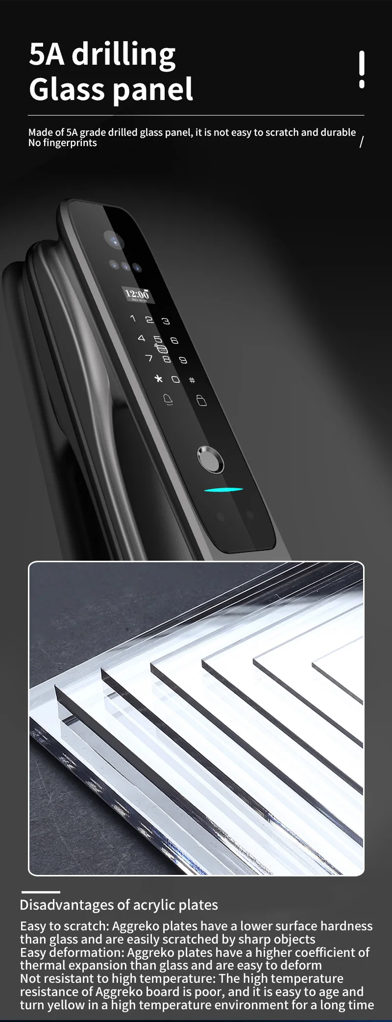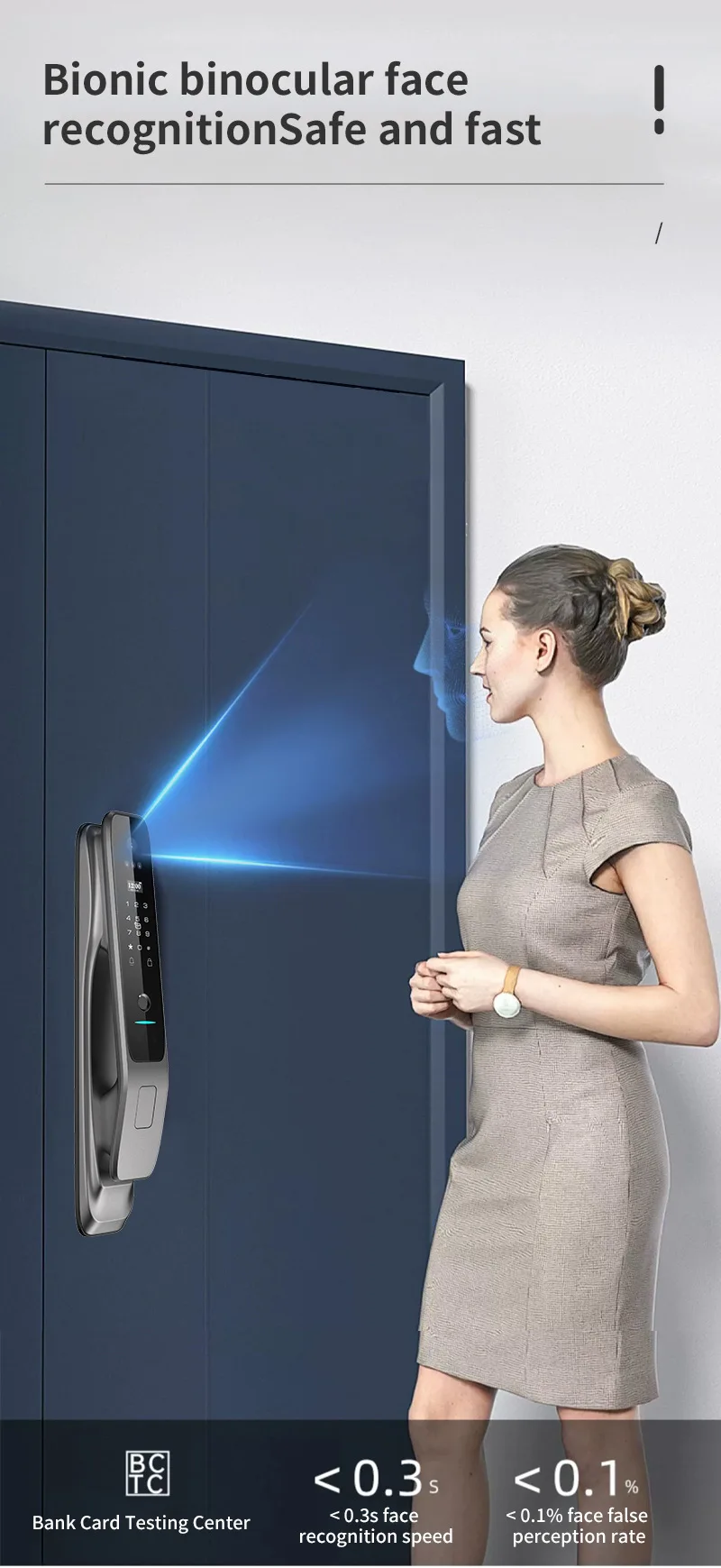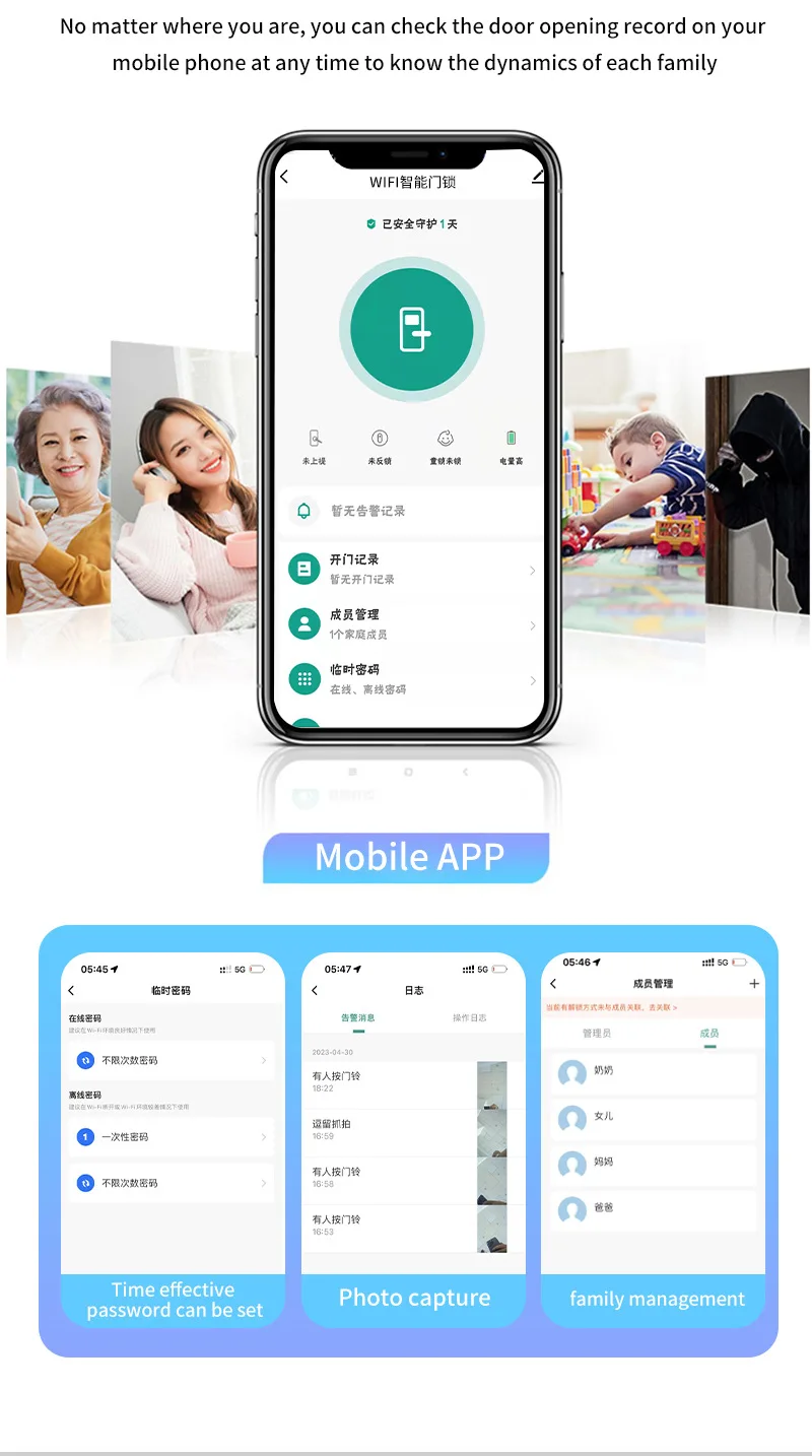 1. 6 moyens de déverrouillage: visage infrarouge 3D, empreinte digitale, mot de passe, carte IC, clé mécanique, application