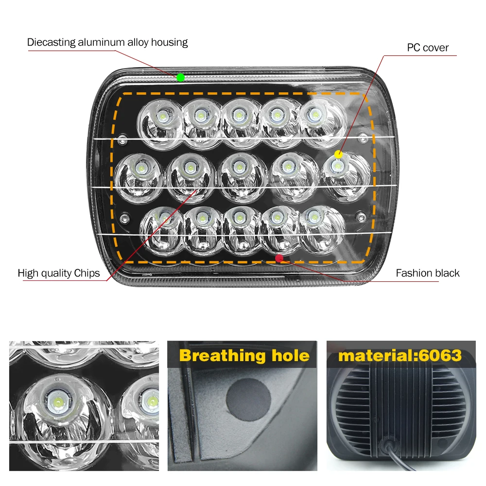 HL-Lampe de sauna de voiture à LED carrée, lumière drapée, faisceaux hauts et bas rectangulaires, Wrangler YJ, 105W, 6000K, H4, 5×7, 7×6 pouces