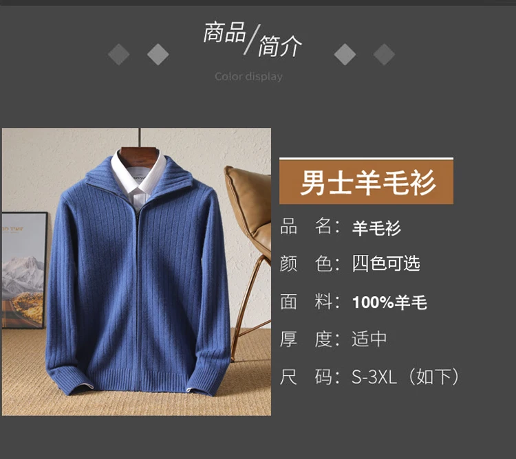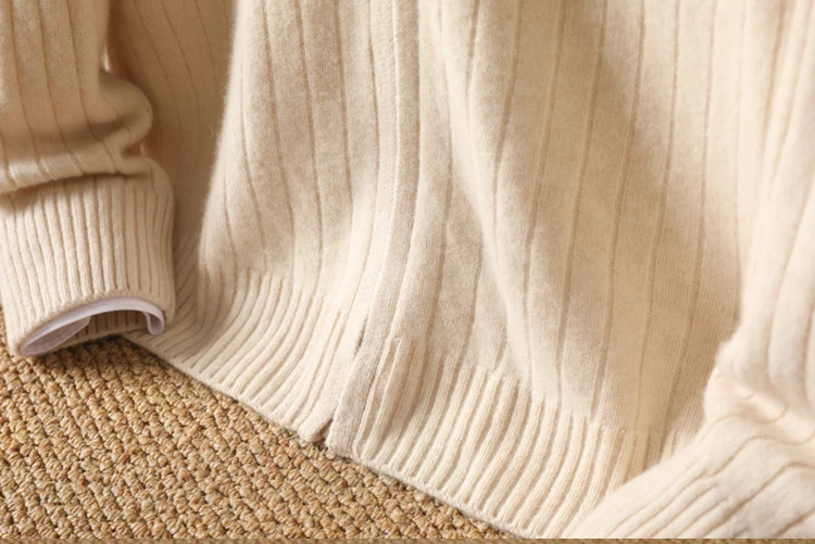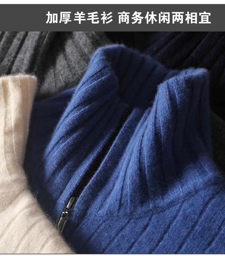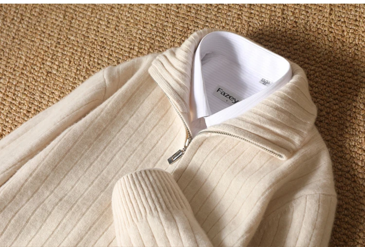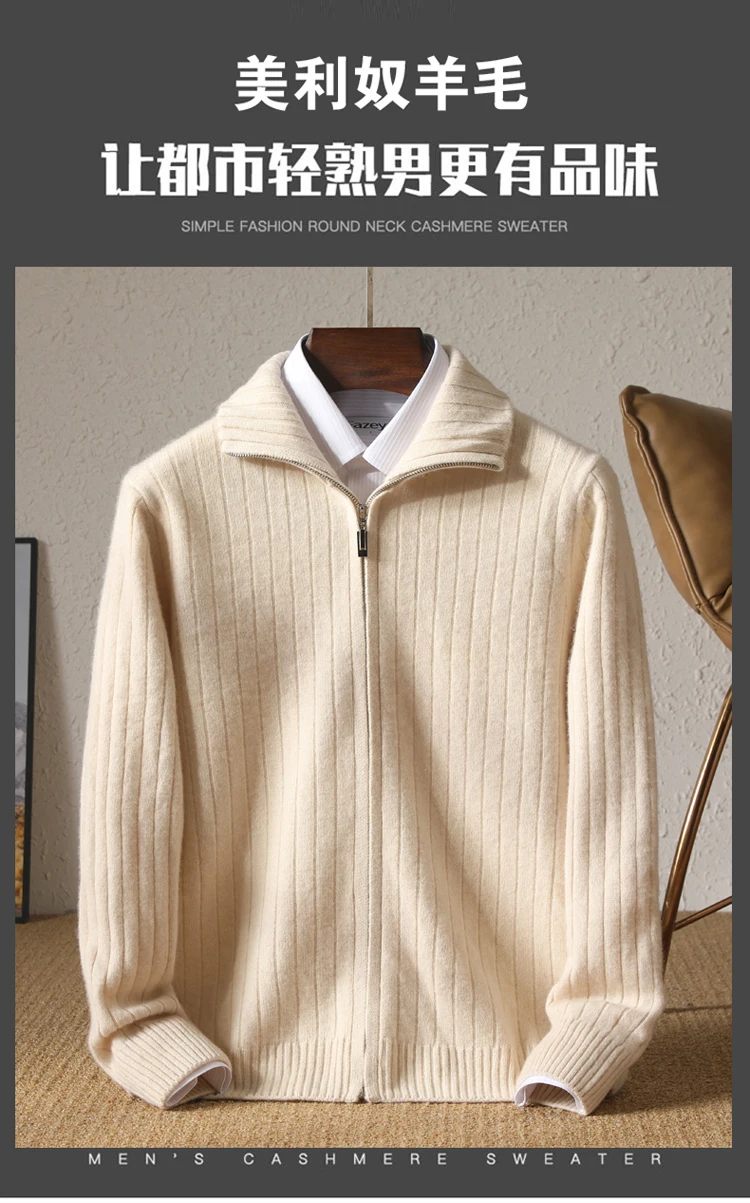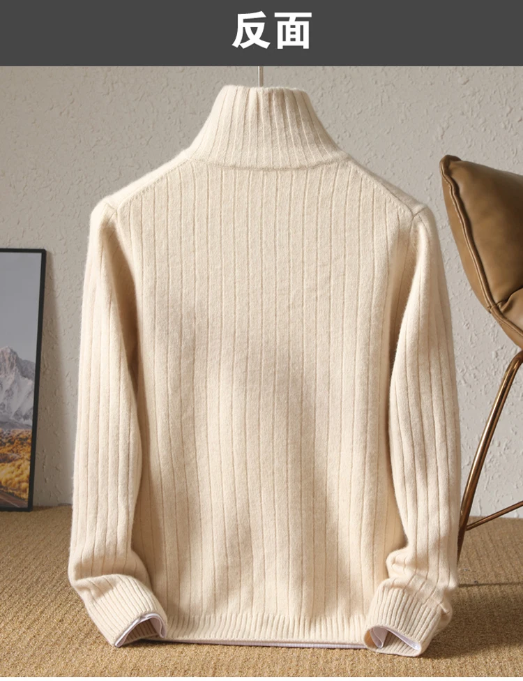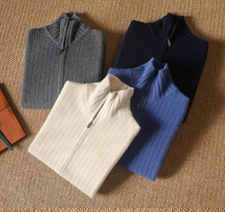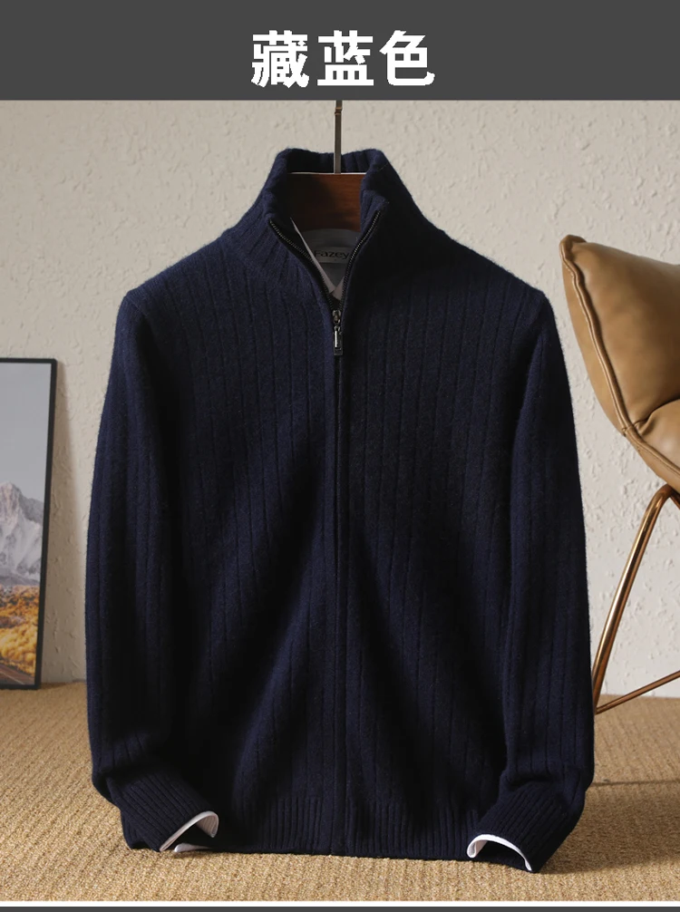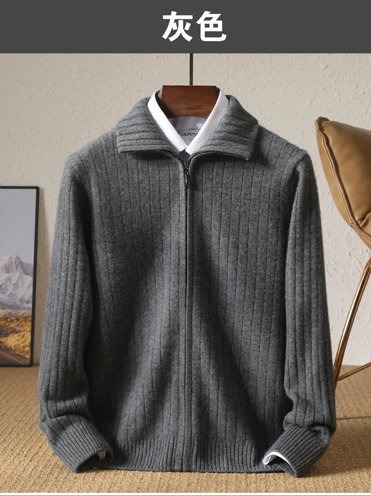 Cardigan Épais avec Fermeture Éclair pour Homme, 100% Laine, Tricot, Col Haut, Haut Large Rayé, Manteau Chaud, Mode Mérinos, Automne et Hiver, Nouveau